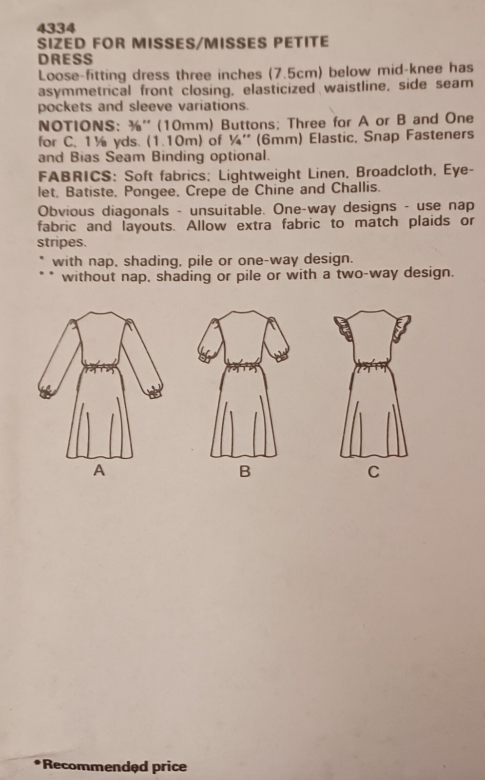4334 Butterick Sewing Pattern Uncut Misses 8 Loose Fit Midknee Asymetrical Dress Ebay